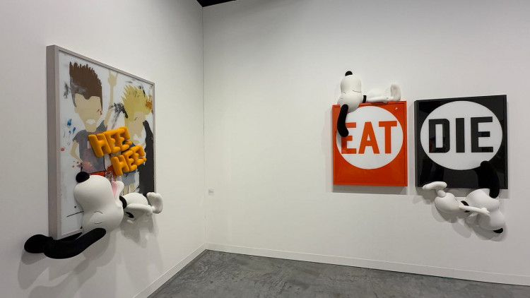 Renklendirilmiş duvarlar, klasikten her zaman daha iyi. Eserin duvara asılmayıp duvarın kendisi formunu alması [04:59] bambaşka. Singapur ve Sidney’de faaliyet gösteren Ames Yavuz standında duvarın kendisi haline gelmiş bir çalışma var. Kaylene Whiskey, ‘Come party with me!’de keten üzerine akrilik kullanmış ancak çalışma öyle yerleştirilmiş ki fuar öncesinde duvarın kendisi üzerine çalışılmış sanıyorsunuz. Öyle ki kısmen küçük ebatlı görseller duvardan taşarak stand numarasının üzerine çıkıyor. Benzer uygulamaları daha sık görmek isterdim.