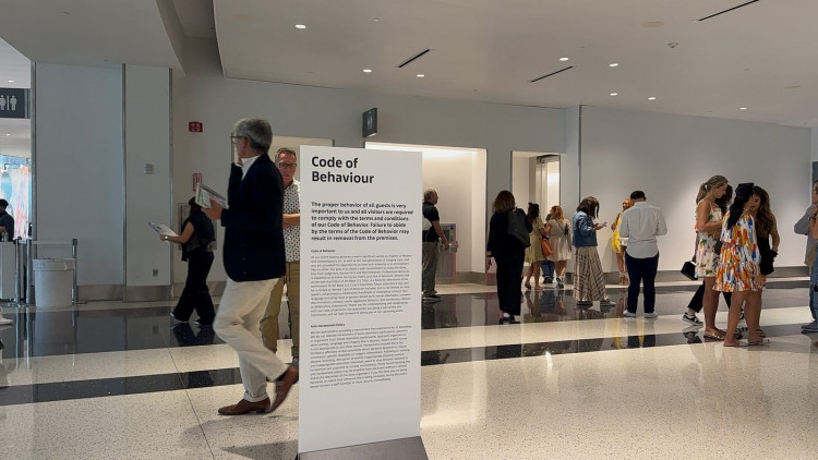 The ‘Code of Behaviour’ panel placed at the center of the foyer [00:05] communicates the venue’s rules to visitors in a clear and direct language. The organization emphasizes that appropriate behavior by all guests is critical to the fair’s security and proper functioning. Everyone is obliged to comply with the conditions accepted upon entry and the fair’s general conduct policies, with explicit notice that visitors may be removed if these rules are violated. The text goes on to underline the sensitive nature of contemporary art fairs. Protecting exhibited works, ensuring the safety of artists and gallerists, maintaining order in crowded spaces, and safeguarding each visitor’s experience within a framework of respect are cited as fundamental reasons for these rules; physical contact, disruptive behavior, or actions endangering the crowd are stated to be entirely intolerable. The lower section of the panel specifically includes an ‘Anti–Harassment Policy’, noting the intention to provide a safe and inclusive environment for all participants and clearly stating that any form of harassment, pressure, verbal or physical discomfort is unacceptable. In such cases, visitors are advised to contact staff or security immediately.